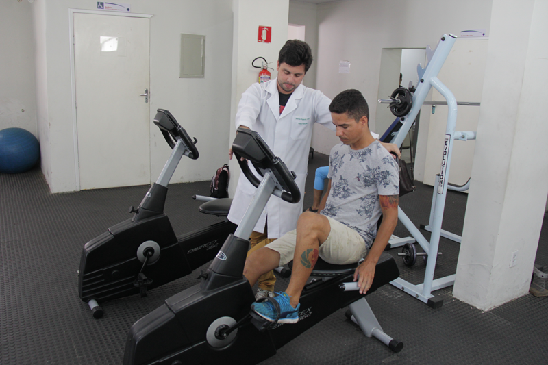 Com atletas amadores a terapia é realizada com exercícios nos aparelhos da academia do Centro de Reabilitação e fisioterapia convencional.